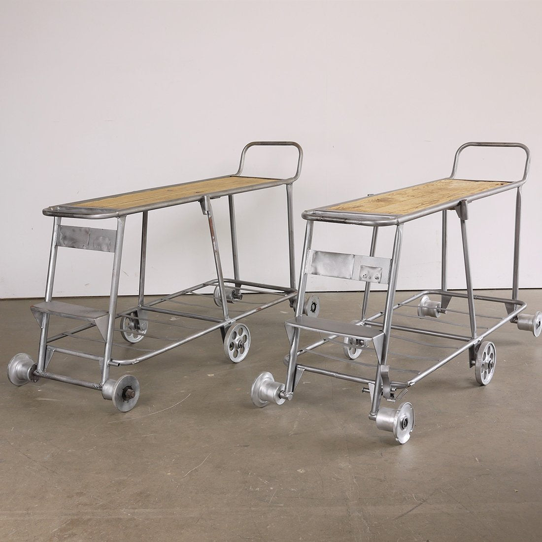 The trolleys were salvaged from a huge state nursery. The solid cast aluminium wheels give a clue to their practical use running on rails for easy movement of plants around the site. We love these unusual industrial pieces as they have so many practical uses.