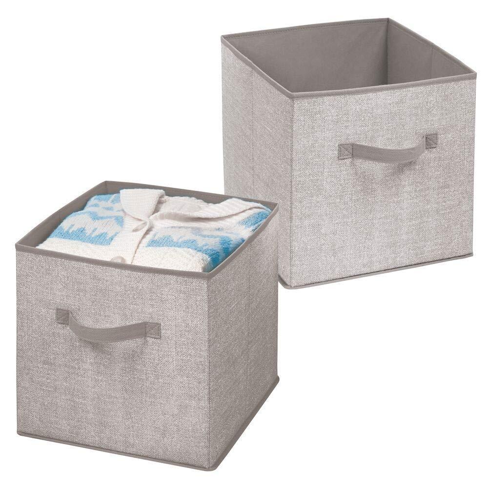 - STORAGE MADE SIMPLE: These large capacity bins with square format are ideal for cube storage shelving units, these bins fit nicely into each cubby; Use in storage units, or use these on any shelf or inside cabinets to create the storage solution that works best for you; Great for creating a clean, organized closet or bedroom - store hats, scarves, gloves, accessories, jeans, sweaters, workout clothing and gear, yoga pants, leggings, out-of-season clothing, and extra blankets or linens; Set of 2