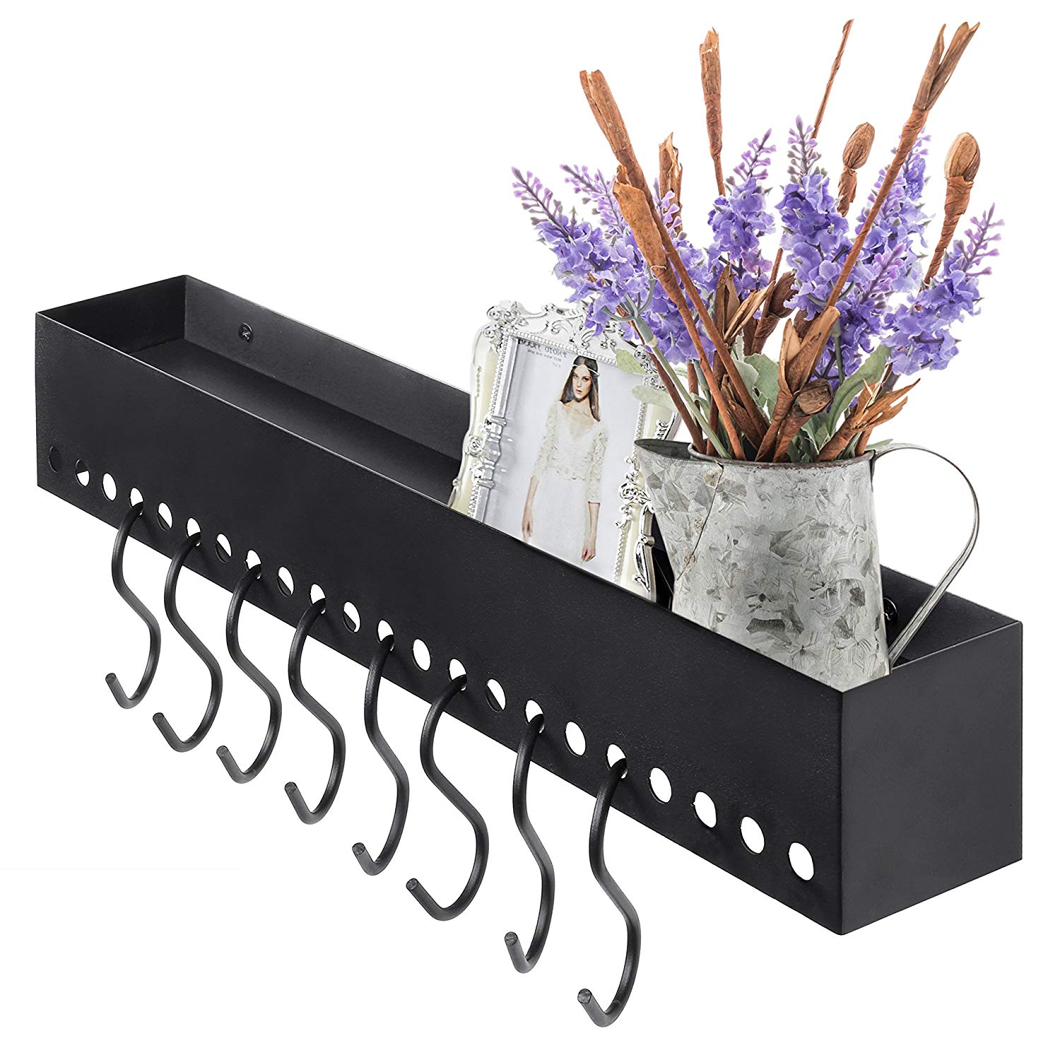 MyGift Modern Metal Floating Wall Shelf with 8 Removable S-Hooks, Dark Gray