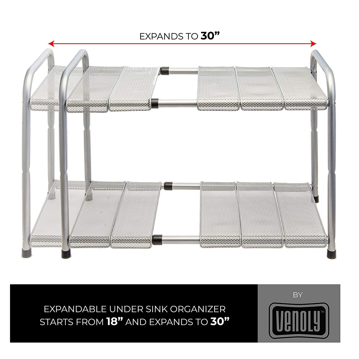 Venoly Home - Under Sink 2 Tier Expandable Shelf Organizer Rack, Silver - Expands from 18 Inches to 30 Inches