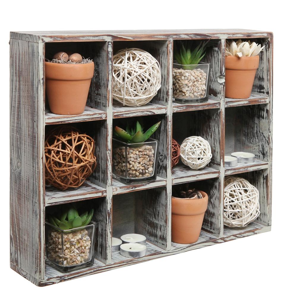 Display your favorite knickknacks, keepsakes, collectible baseball, and accessories in this charming shadow box. Made of sturdy and stylish wood, this lovely shelf rack provides you with 12 square compartments that are perfect for displaying small items like decorative teacups, figurines, and favorite pieces of jewelry. Just stand this wooden shelving unit on its side or mount it on a wall using the appropriate installation hardware (not included) and the attached metal brackets to give any space the perfect combination of style, storage, and display space.
