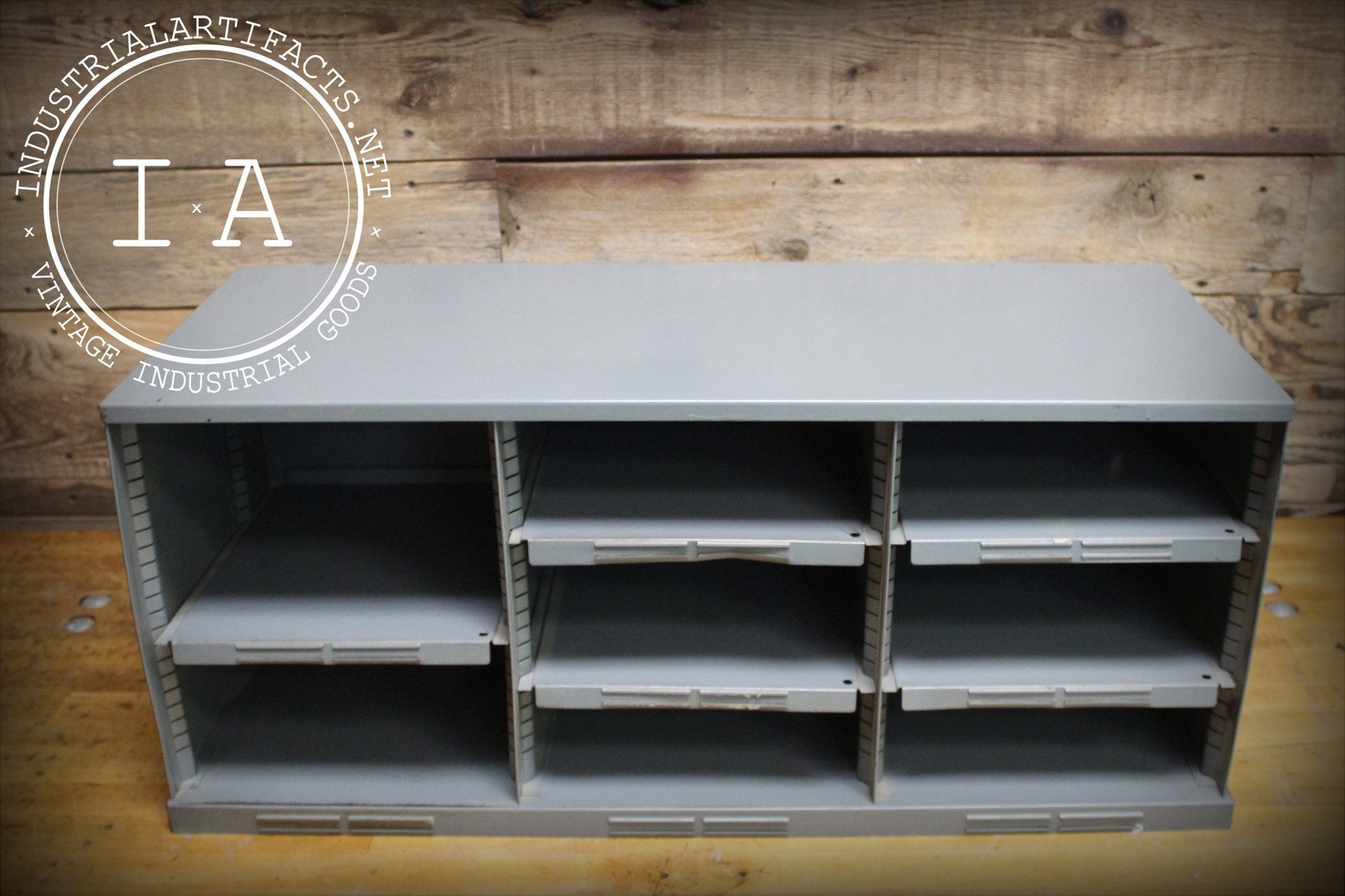 This vintage shelving unit has 5 shelves that are adjustable within 3 rows that include 20 shelf slots 1/2" apart vertically. It would make an excellent addition to any office, studio or warehouse. It measures 30" x 12" x 13" tall with 3 9 1/2" rows. This is a vintage item that is worn but in good condition for its age as pictured.